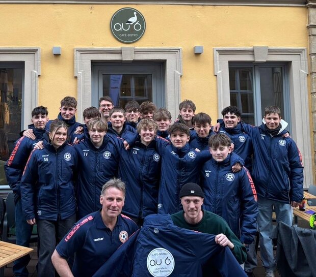 Die B-1 bedankt sich herzlichst bei Thomas KAMM, Inhaber des Cafe-Bistro “AU 6” in Bamberg, Austraße 6, für Wärmejacken, die er der Mannschaft sponsorte. Am 19.03. besuchte das Team Thomas und sein Cafe und hierbei entstand das Mannschaftsfoto. Thomas, ehemaliger Spieler unserer Mannschaften aus Frensdorf, zeigte somit seine Treue zum Verein und unterstützt uns bei der Jugendarbeit. Vergelt`s Gott hierfür!